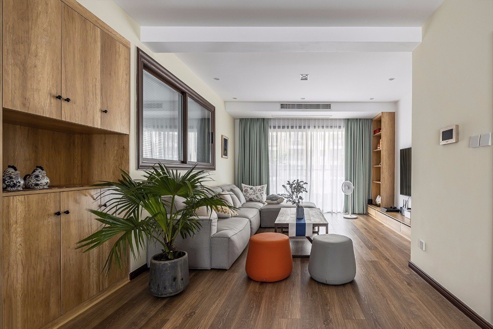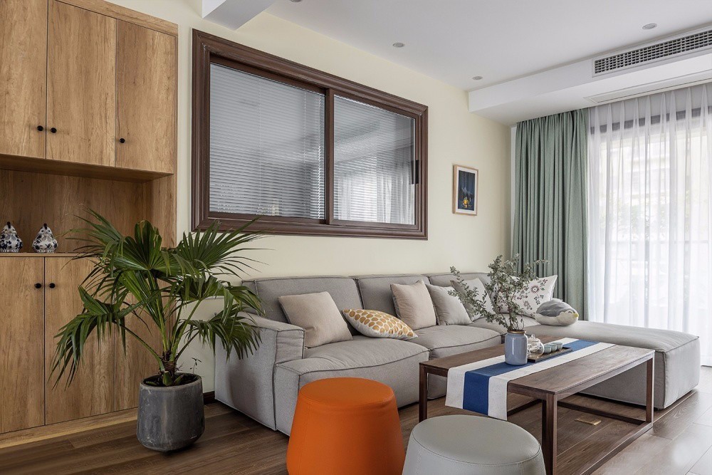 客廳利用半墻加窗戶的形式與書房連接,并在沙發(fā)背景墻左側(cè)利用書房空間做成了儲物柜,將行李箱安置地妥妥的,中部留空的設(shè)計便于小物件的取放。