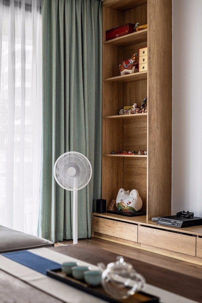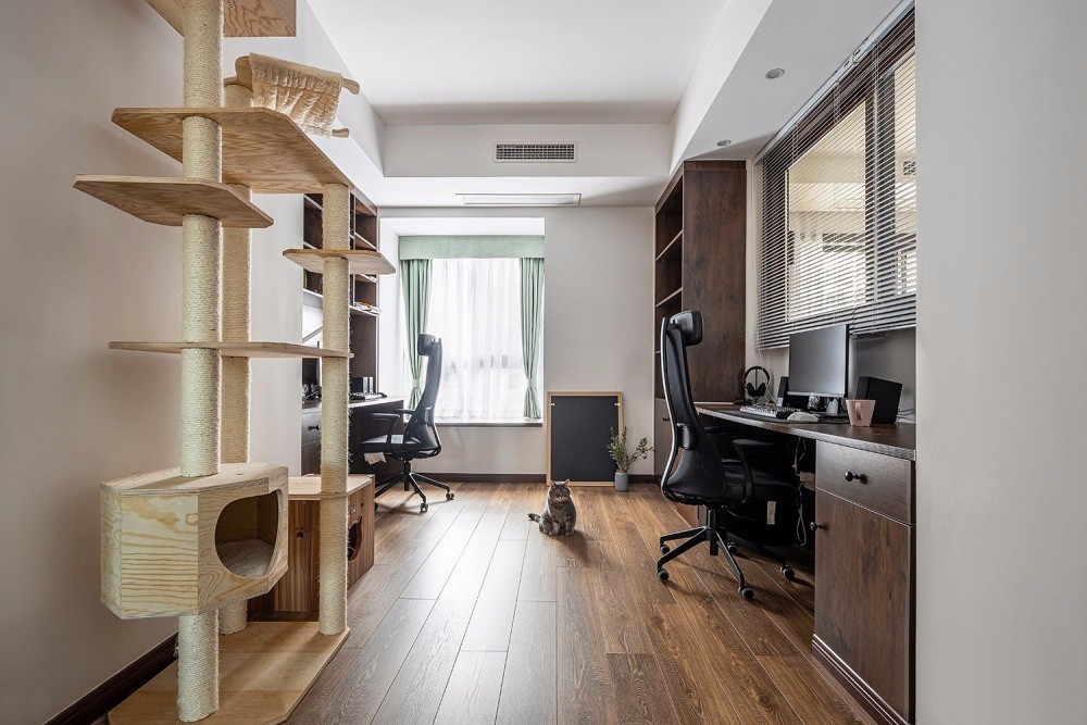 書房,貓爬架滿足了貓咪的娛樂,兩個書桌的設(shè)計,為愛打游戲更愛工作的屋主提供一個自由而愜意的空間。書房與客廳打通之后,采光通風都增強了不少。百葉窗簾具有良好的透氣性和隱私性,還可以提升空間的顏值與氣質(zhì)。