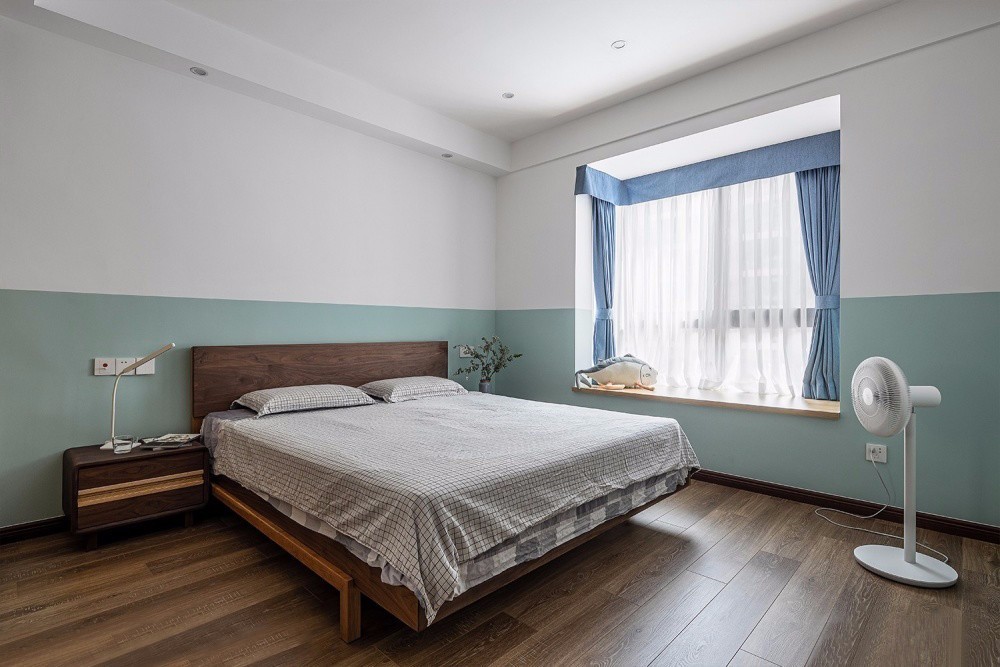 主臥墻面采用白色與淺綠色上下分色的涂刷效果,形成獨特的圍和感。簡潔舒適的灰調(diào)床品,營造寧靜安逸的睡眠氛圍。加入綠植的點綴,帶來清新自然的味道。