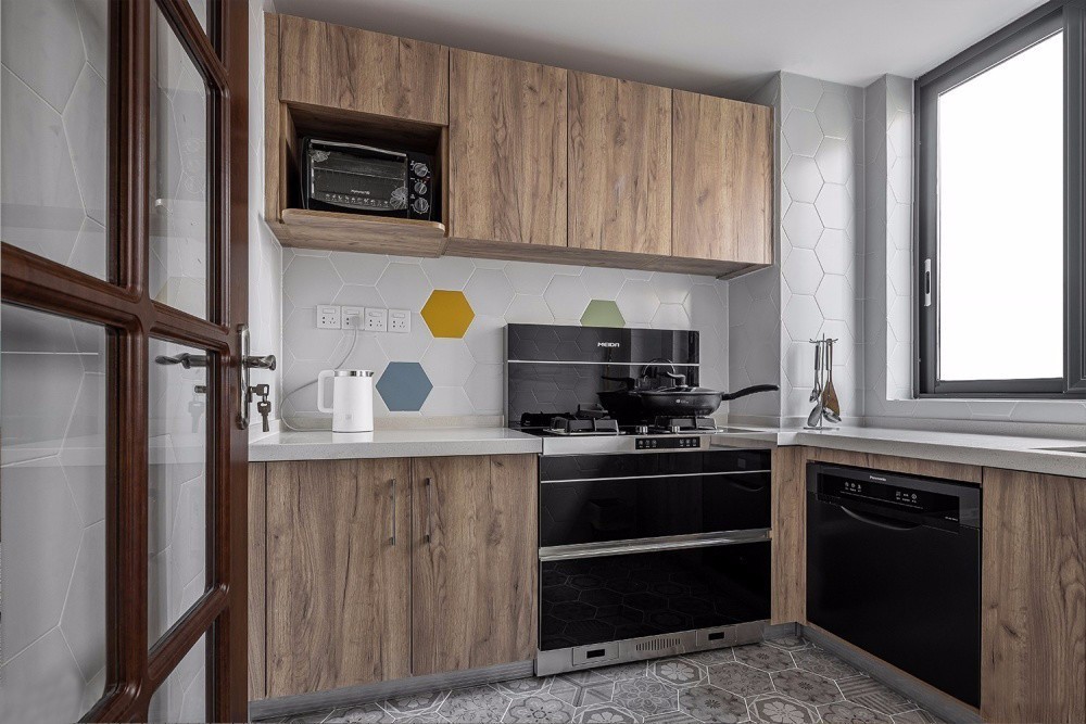 廚房墻面鋪設(shè)淺灰色六角磚,點綴藍色黃色與綠色,為空間增添了跳躍靈動感。與木質(zhì)櫥柜完美結(jié)合,簡約自然中透露著精致感。