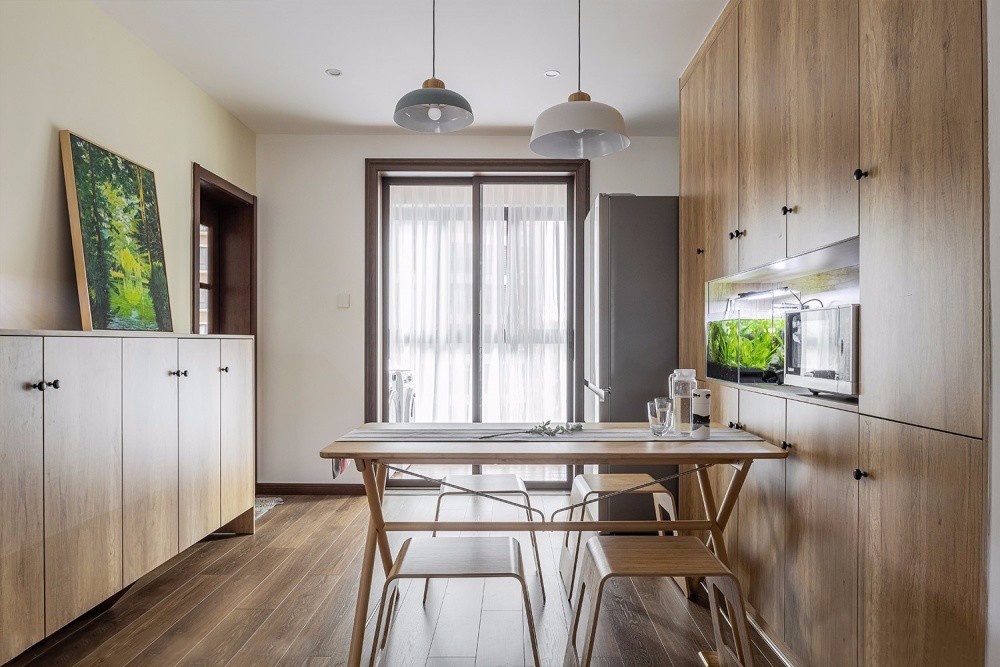 原木餐桌搭配簡單實用的紙片凳,簡約樸質(zhì)而又利落。餐邊柜中空的設(shè)計,方便以后添置使用各種家電,提升幸福感與實用度。廚房墻面鋪設(shè)淺灰色六角磚,點綴藍色黃色與綠色,為空間增添了跳躍靈動感。與木質(zhì)櫥柜完美結(jié)合,簡約自然中透露著精致感。