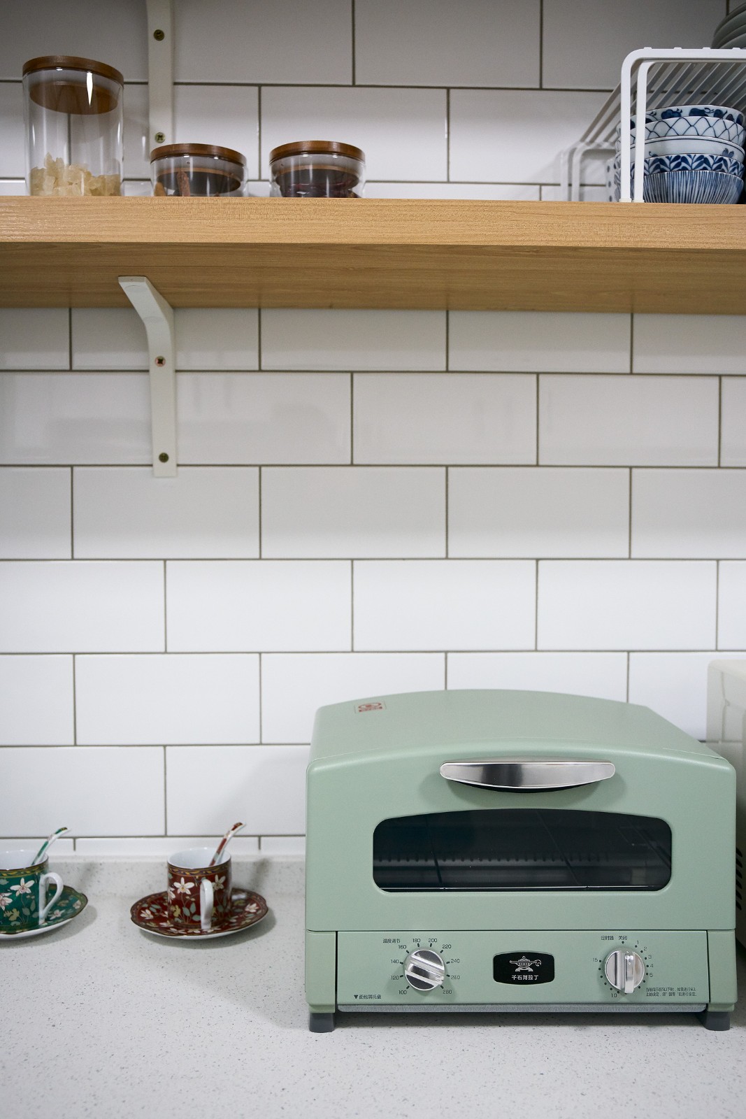 小白磚錯落,黑色櫥柜把手十分精致。