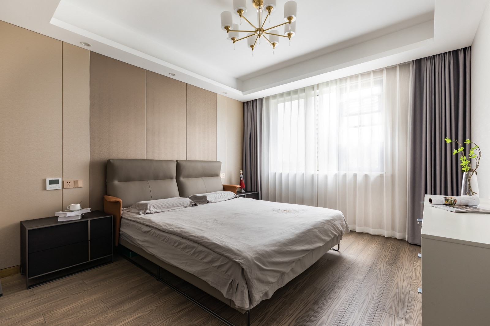 主臥整體灰調(diào),淺色灰背景墻,搭配深灰色皮質(zhì)床靠背,棕色木紋家具經(jīng)典。