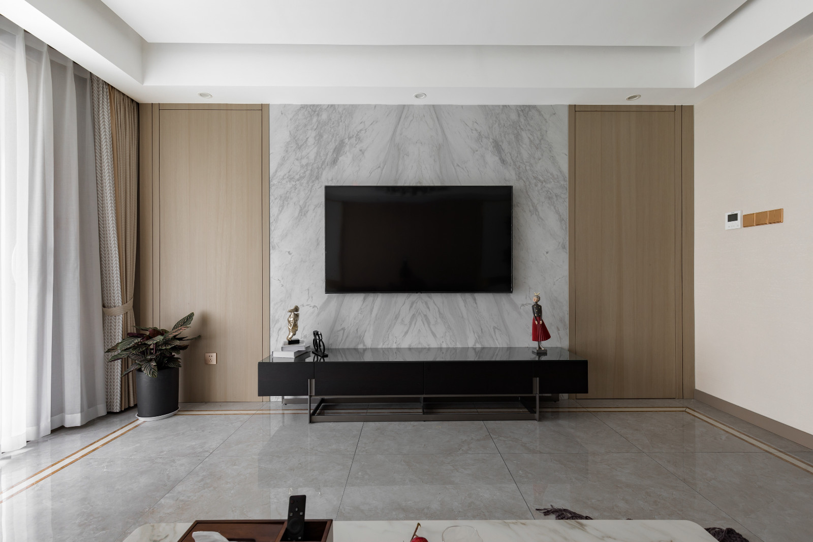 客廳戶型方正,整面木飾面板裝飾沙發(fā)背景墻,原木家具搭配米色布藝沙發(fā),文藝淡雅。